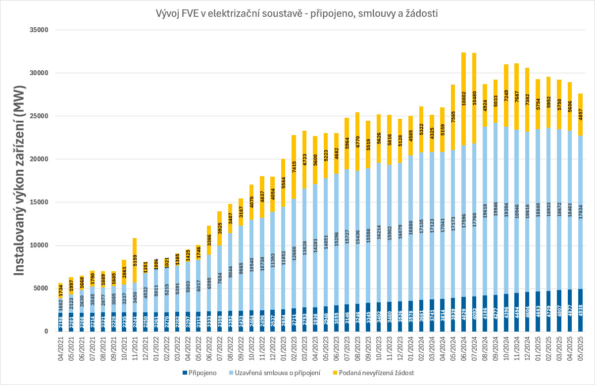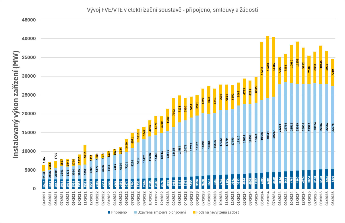 - Při započtení zdrojů s uzavřenou smlouvou o připojení či podanou žádostí dosahuje celkový výkon téměř 35 000 MW.