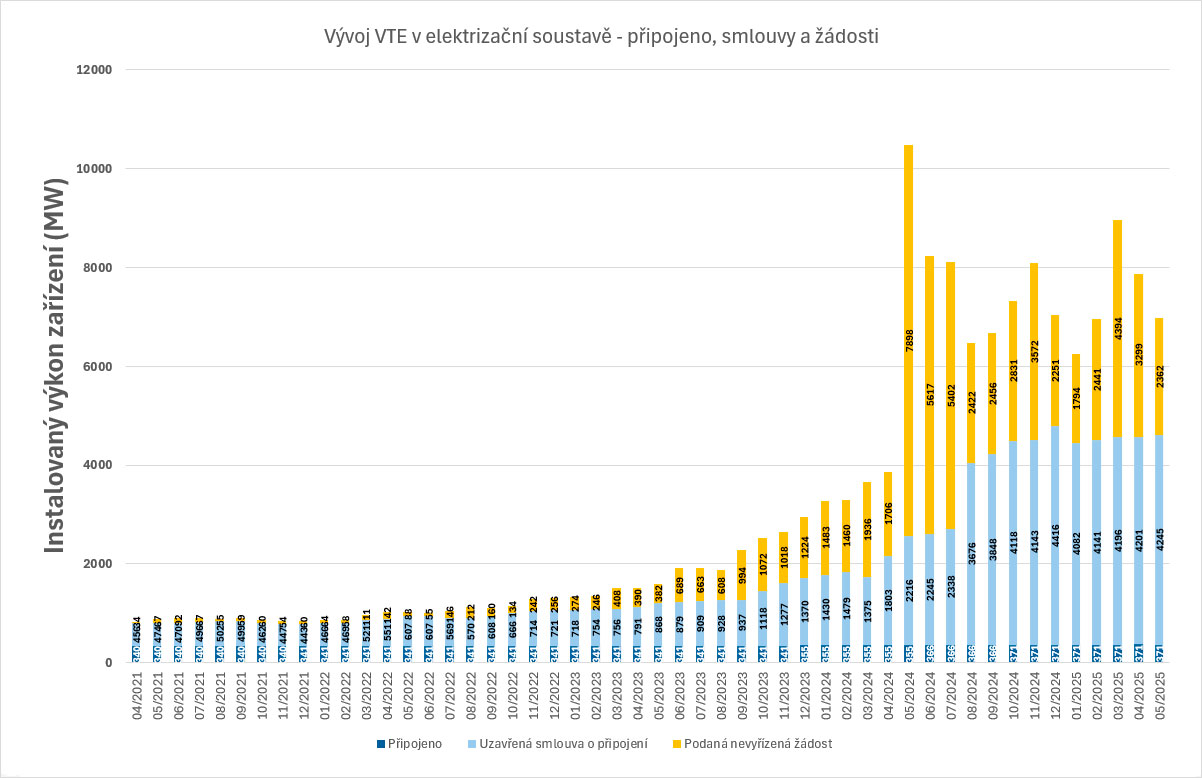 - Instalovaný výkon všech aktuálně připojených FVE a VTE zdrojů překračuje 5300 MW.